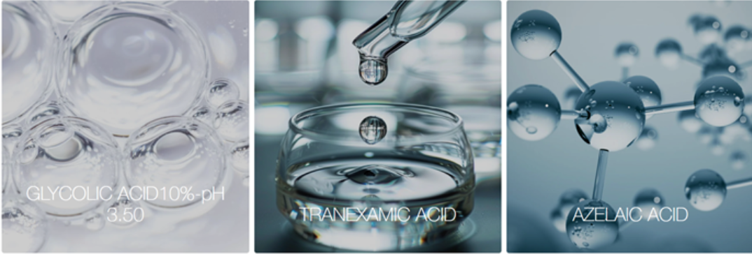 + Glycolic Acid 10% (pH 3.5) : Làm mới và kích thích quá trình tái tạo tế bào, chống lại tình trạng mất sắc tố, đốm đen và dấu hiệu lão hóa.