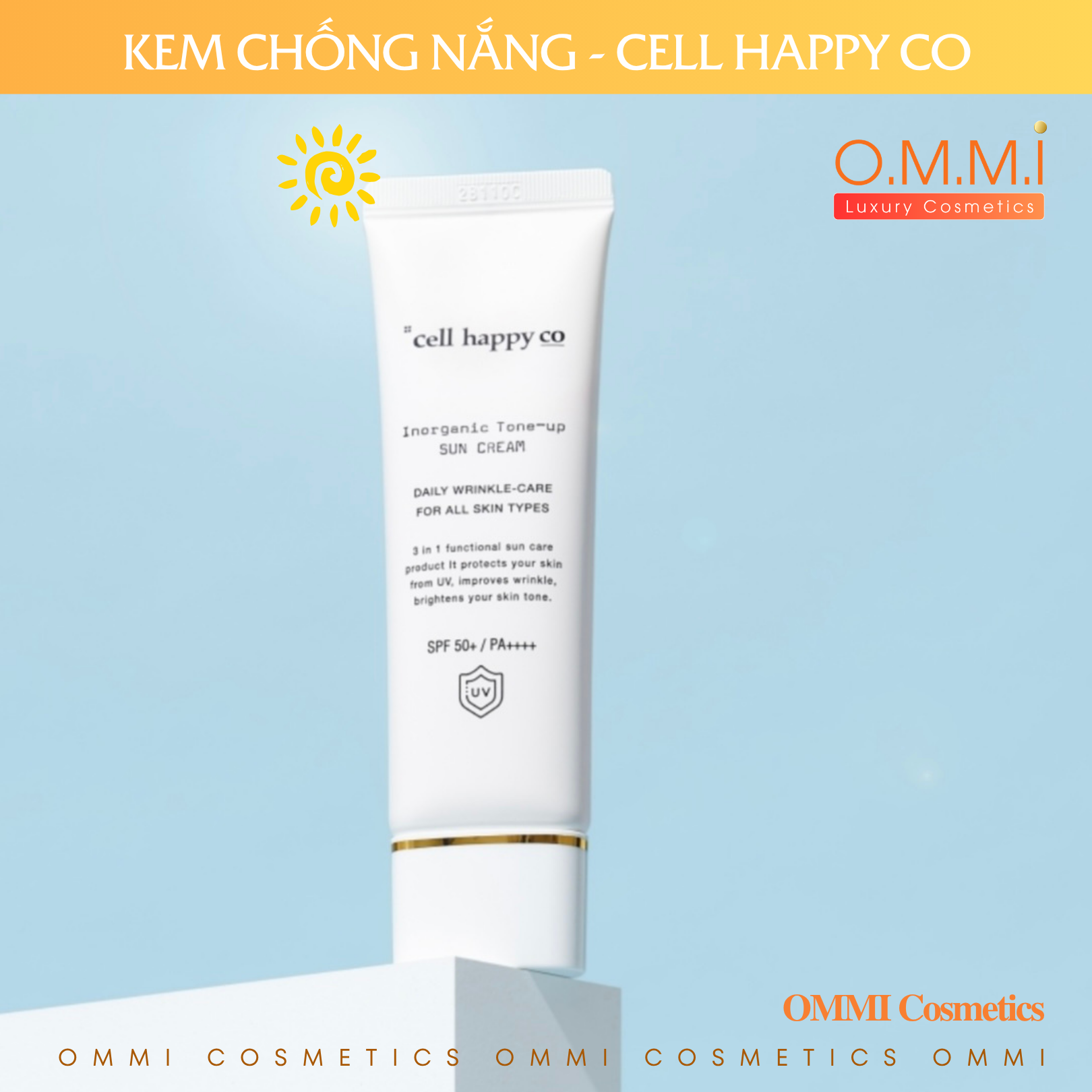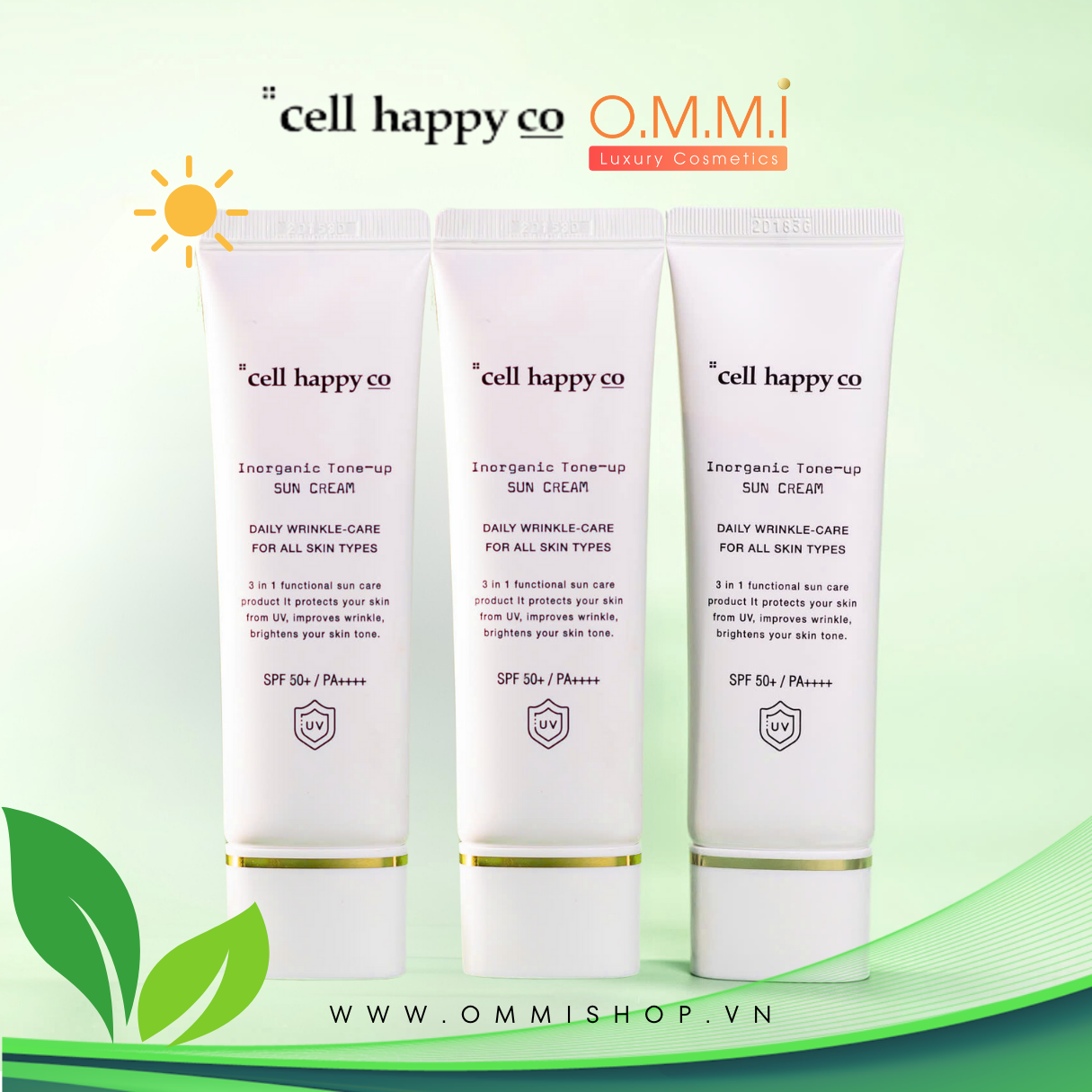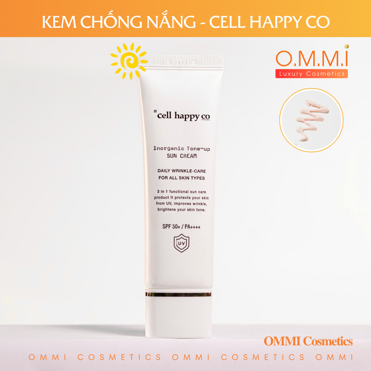 - Kem chống nắng Cell Happy Co với chỉ số SPF50+ PA++++ là loại kem chống nắng phổ rộng. Đồng thời có chức năng dưỡng trắng, dưỡng ẩm, cải thiện ngăn ngừa nếp nhăn, chống tia UV bảo vệ da ngăn chặn hình thành sắc tố Melanin gây nám da.
