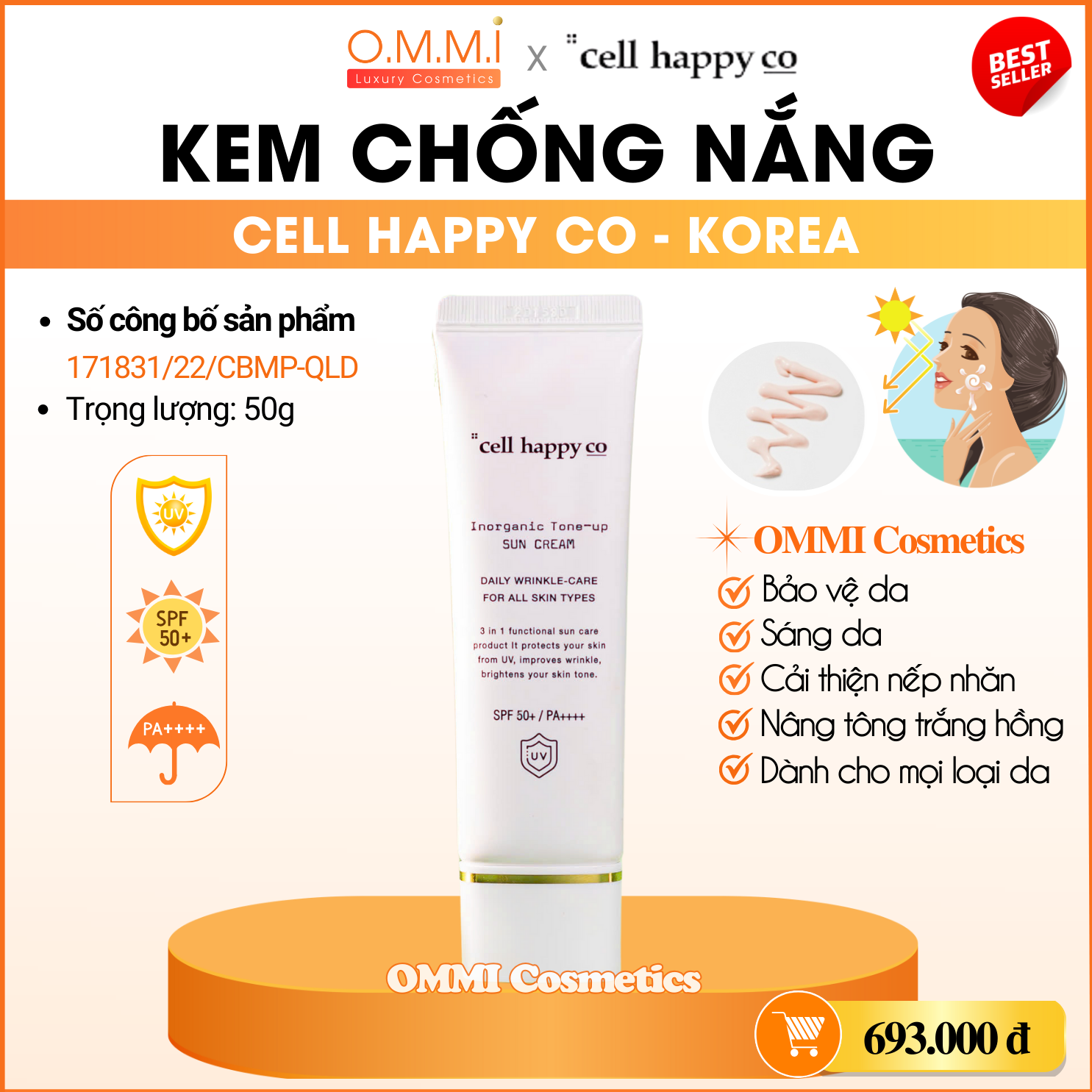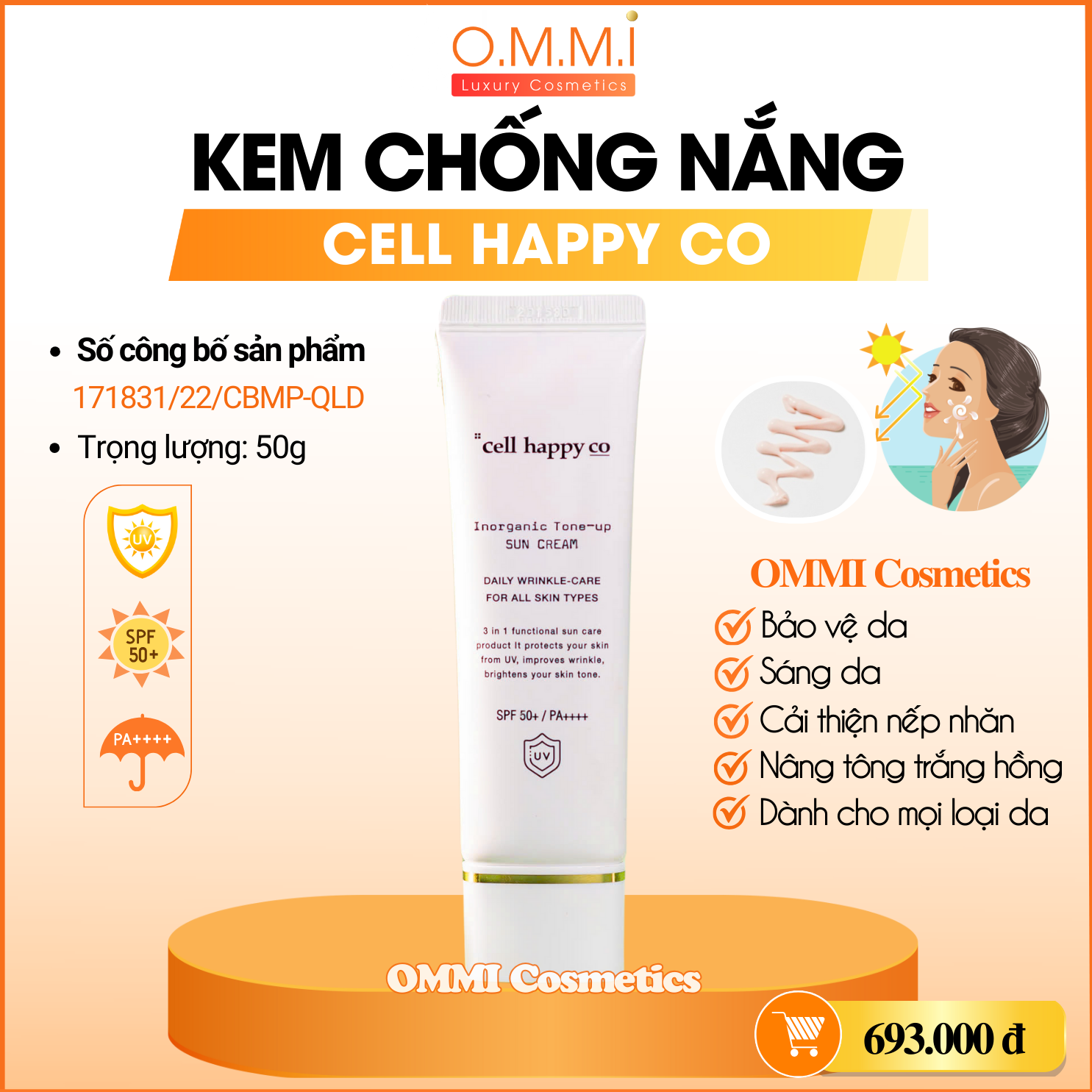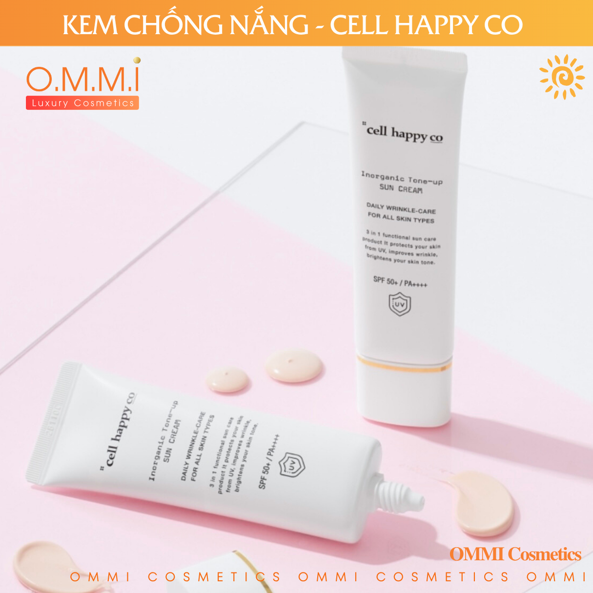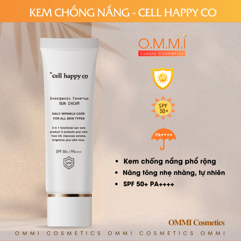 - Kem chống nắng Cell Happy Co với chỉ số SPF50+ PA++++ là loại kem chống nắng phổ rộng. Đồng thời có chức năng dưỡng trắng, dưỡng ẩm, cải thiện ngăn ngừa nếp nhăn, chống tia UV bảo vệ da ngăn chặn hình thành sắc tố Melanin gây nám da.