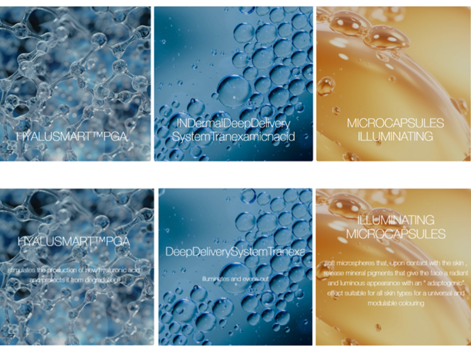 * Kết hợp các thành phần hoạt động độc đáo : Tranexamic Acid, Next-Generation Photostable Filters, Illuminating Microcapsules, Advanced Hexapeptide-1, Hyalu Smart™ PGA…