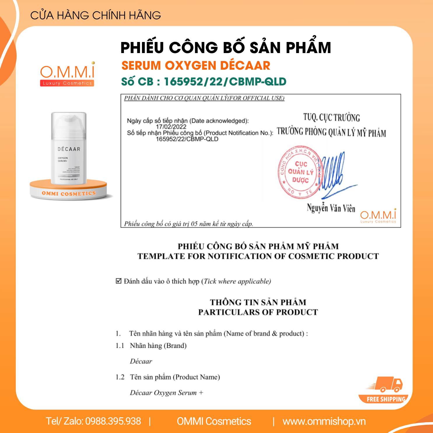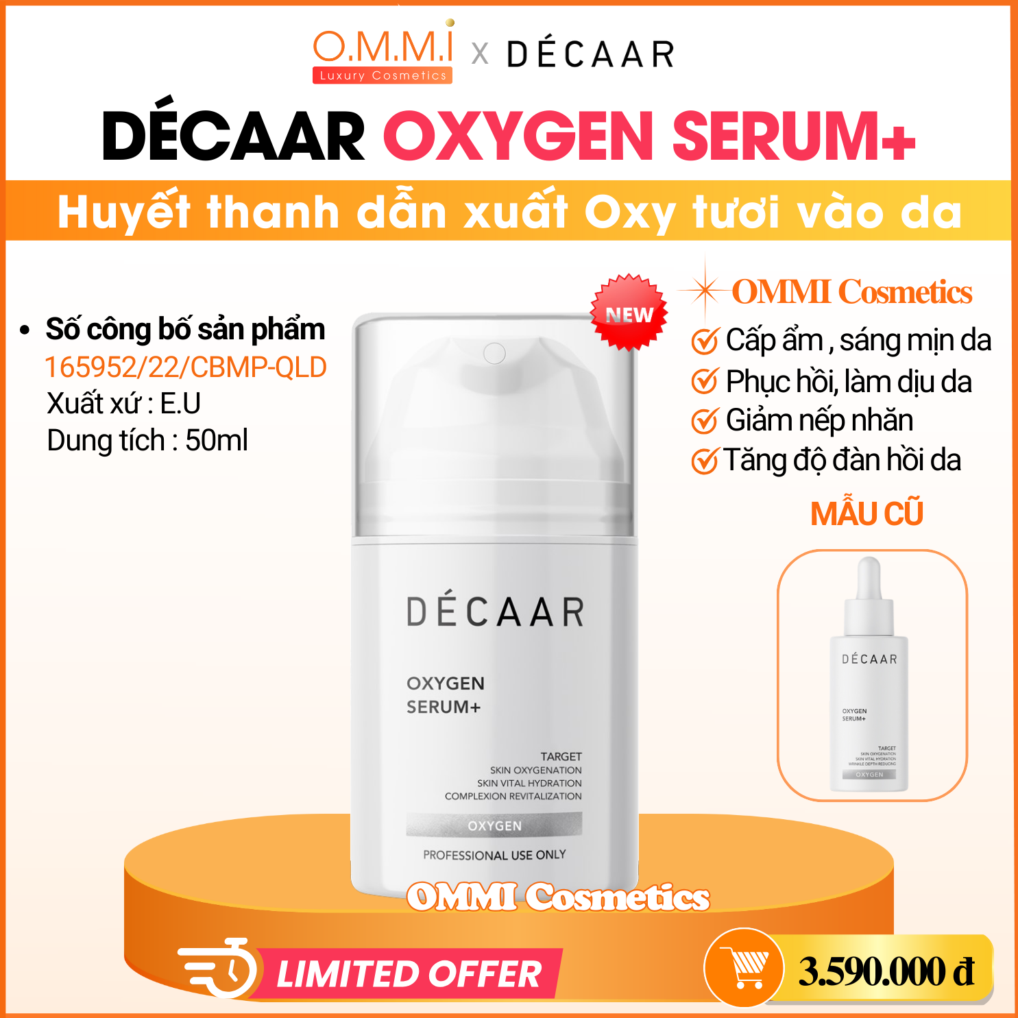 - Serum Oxygen DÉCAAR với công thức độc quyền kết hợp các thành phần rất đặc biệt và độc đáo để thổi sức sống mới vào làn da mệt mỏi, làm mịn các đường nhăn và nếp nhăn trên khuôn mặt, đồng thời giúp da được trẻ hóa sâu, ngậm nước và tươi trẻ.